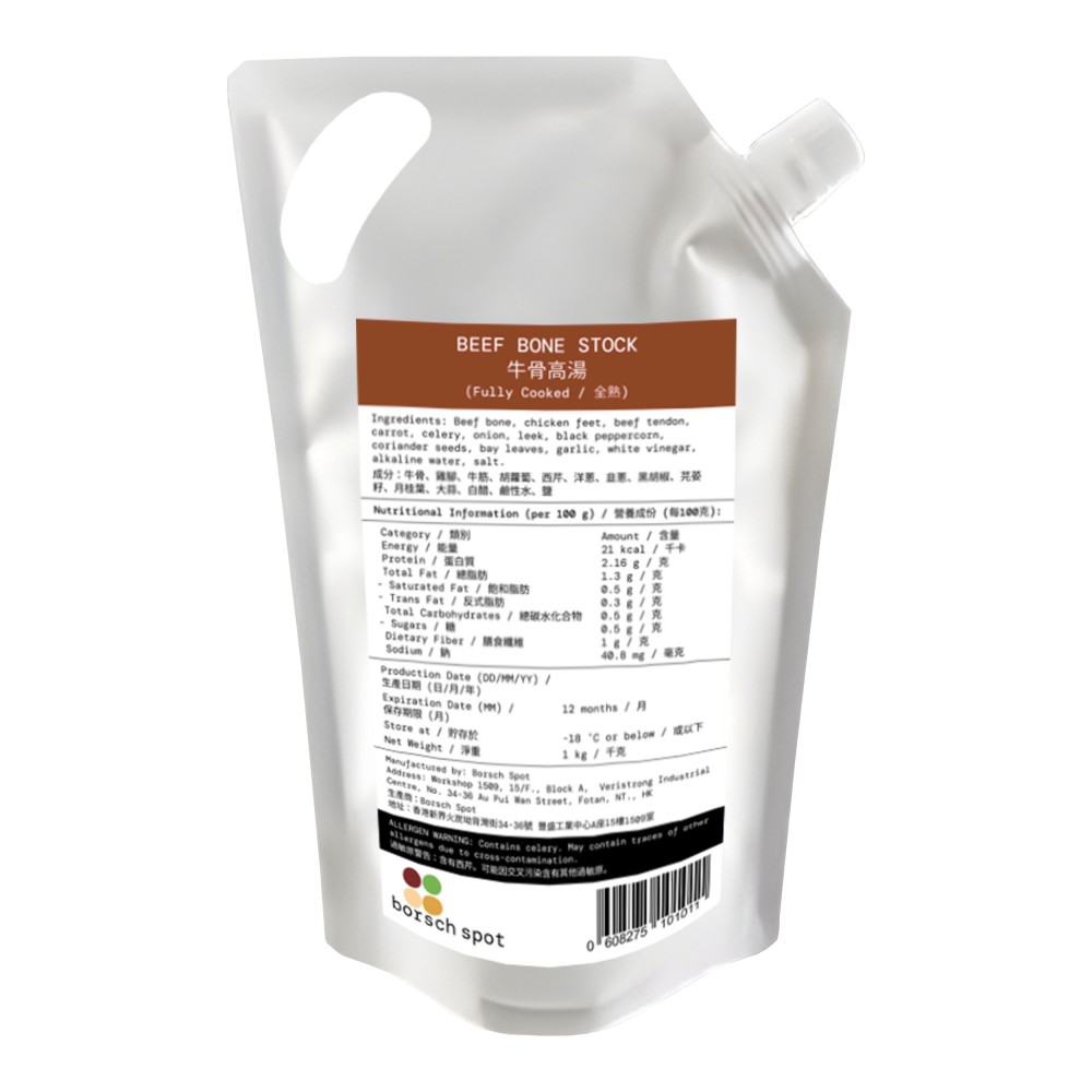 Ingredients: Beef bone, chicken feet, beef tendon, carrot, celery, onion, leek, black peppercorn, coriander seeds, bay leaves, garlic, white vinegar, alkaline water, salt.