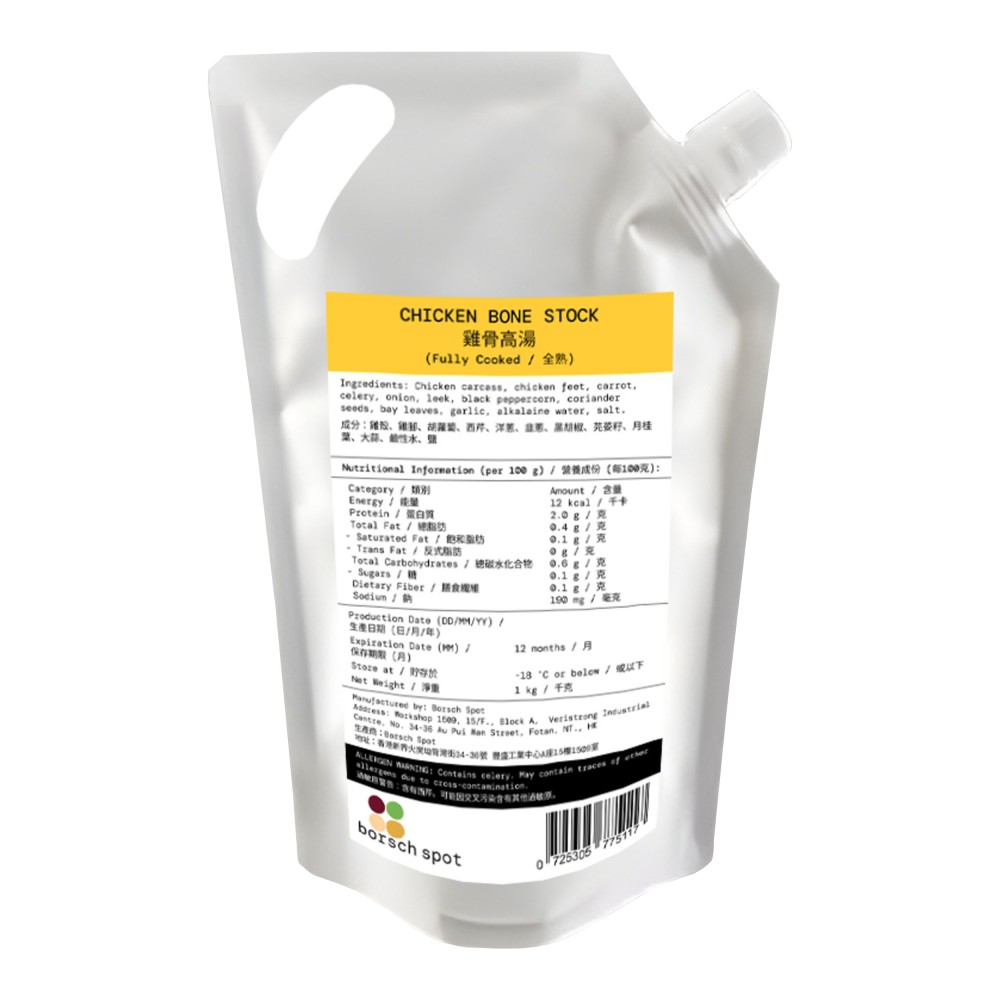 Ingredients: Chicken carcass, chicken feet, carrot, celery, onion, leek, black peppercorn, coriander seeds, bay leaves, garlic, alkalaine water, salt.