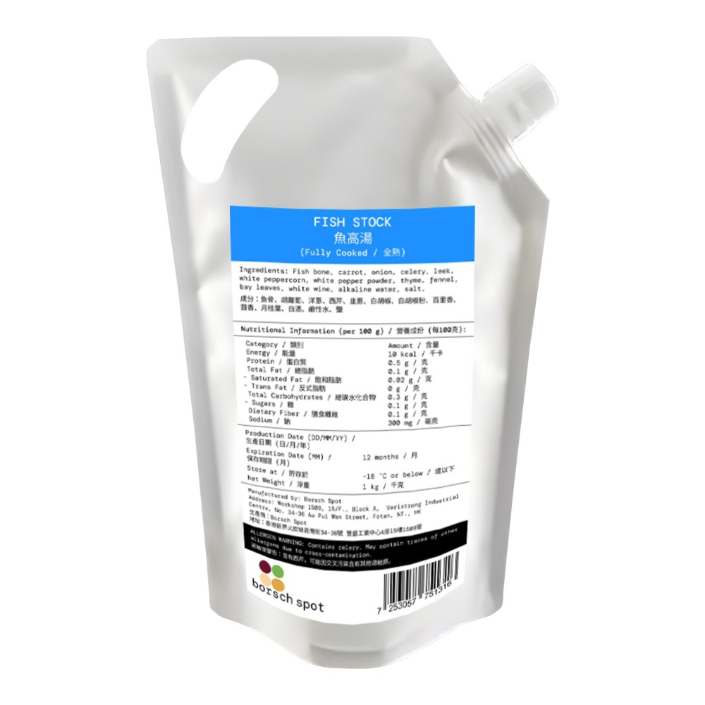 Ingredients: Fish bone, carrot, onion, celery, leek, white peppercorn, white pepper powder, thyme, fennel, bay leaves, white wine, alkaline water, salt.
